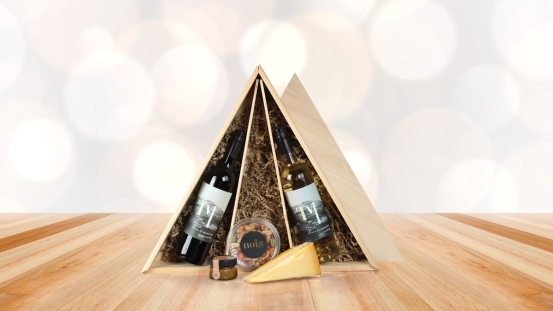 Het Tierra de Montaña pakket combineert het beste van de natuur met pure smaak. Twee vegan-biologische wijnen bestaande uit een frisse Verdejo en een volle Tempranillo vormen de basis van dit luxe geschenk. Daarbij horen een royaal stuk extra belegen kaas, een verfijnde mosterd-dille dip en een knapperige Zeistermix. Stijlvol verpakt in een houten driehoekkist met schuifdeksel en vakverdeling is dit een cadeau dat klasse en duurzaamheid uitstraalt.